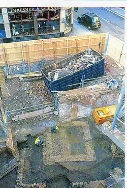 Some Claudian-era camp ditches have been discovered,[48] but archaeological excavations undertaken since the 1970s by the Department of Urban Archaeology at the Museum of London (now MOLAS) have suggested the early settlement was largely the product of private enterprise.[49] A timber drain by the side of the main Roman road excavated at No 1 Poultry has been dated by dendrochronology to 47 AD.[6]