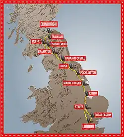 The Event had controls at Northstowe, Boston, Louth, Hessle, Malton, Richmond, Alston, Brampton, Hawick, Moffat and Dalketh on the way North. The return route included Innerleithen and Eskdalemuir but not Hawick.[10]