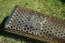 The shape of the torch makes it easily gripped, as does its textured surface, which is perforated with 8,000 holes. [2] The holes represent the 8,000 runners in the London 2012 Torch Relay and the 8,000-mile (13,000 km) relay distance.[3] Functionally, they reduce the torch's overall weight and ensure that heat from its flame is dissipated without conducting down the handle.[4][5] They create a level of transparency in the torch, where one can see through to the flame and burner mechanism, and they also allow a 'fuller' flame that escapes from all sides of the Torch, rather than solely from the top, where the flame can tend to be flattened when a torchbearer runs.