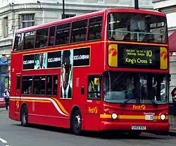 As part of a restructuring of services in the lead-up to the introduction of the London congestion charge, on 1 February 2003, route 10 was split in two: the route between Archway and Kings Cross, and as far as Marble Arch, was taken over by new route 390, and route 10 was shortened to serve only its original route between Hammersmith and King's Cross. Route 390 continued to be operated by Metroline with the AEC Routemasters which had operated route 10, while the new route 10 was operated by First London with Alexander ALX400 bodied Volvo B7TLs.[1]