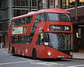 Route 24 dates back to 1910,[1] when it ran between Hampstead Heath and Victoria station. In August 1912 it was extended to Pimlico and has continued in that form until the present day, making this the oldest unchanged bus route in London.[2] Thirty-three Daimler double-decker buses with 34 seats were allocated to route 24, now running between Pimlico and Hampstead, with the fleet name "British" painted in green livery. These buses were running from Camden Town (AQ) garage until they were replaced by AEC NS-Type buses in 1927.[3] Thirty-three NS-type buses were used on route 24 until 1934.[4]