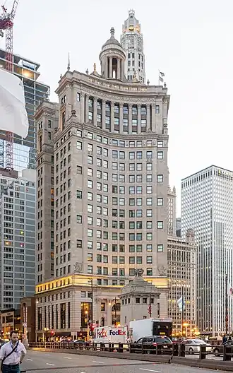 The London Guarantee Building or London Guaranty & Accident Building is a historic 1923 commercial skyscraper whose primary occupant since 2016 is the LondonHouse Chicago Hotel.[1] This neoclassical building, which has also been known as the Stone Container Building for a past tenant,[2] is located near the Loop in Chicago. It is one of four historic 1920s skyscrapers that surround the Michigan Avenue Bridge over the Chicago River (the others are the Wrigley Building, Tribune Tower and 333 North Michigan Avenue) and is a contributing property to the Michigan–Wacker Historic District. The building stands on part of the former site of Fort Dearborn and was designated a Chicago Landmark on April 16, 1996.[3]