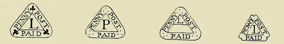 The postmarks on mailings in 1681 have triangles whose longest side is situated at the base and with the word PAID inscribed upside-down within the triangle. (figure 3) There also exist examples of postmarks where the word paid is spelled as PAYD. The initial letter was located within the triangle; 'L' for the London office, 'W' for Westminster, 'S' for the Saint Paul office, however there is speculation that the 'L' marking may have indicated a mailing from the office in Dockwra's home on Lime St.[5][8]
