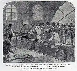 Work started on a 3 ft 8+1⁄2 in (1,130 mm) narrow gauge line from Euston to Holborn in September 1863.[8] The tubes were constructed by the Staveley Coal and Iron Company.[9] The first 'trains' ran on 10 October 1865 after a demonstration in which the chairman, Richard Temple-Grenville, 3rd Duke of Buckingham and Chandos, travelled from Holborn to Euston in one of the capsules.[10][11]