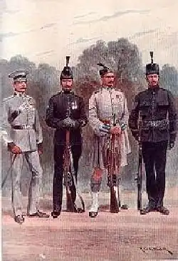 The regiment was first formed in 1908 to regiment the 26 Volunteer Force battalions in the newly formed County of London, each battalion having a distinctive uniform.[2] The London battalions formed the London District, which consisted principally of the 1st and 2nd London Divisions.[3]