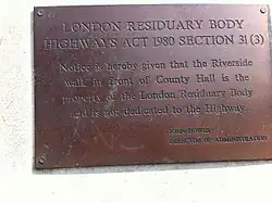 The LRB left few traces: the most prominent being a sign with details for the car park close to the Royal Festival Hall and London Eye – which vanished in 2004 when the car park was built. Another is a sign on County Hall itself relating to the legal position of the walkway on the river front of County Hall signed by John Howes, Director of Administration of the LRB.