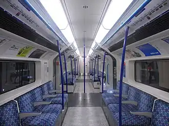 The trains were built using Bombardier's FICAS technology, giving a thinner bodyshell and more internal space for passengers.[45] Overall, the train has a 19% increase in capacity over the 1967 Stock,[38] seating 252 and with standing space for an estimated 1,196 passengers. The electrically powered train doors are wider for easier and faster boarding and alighting of passengers in order to reduce dwell times in stations.[43]