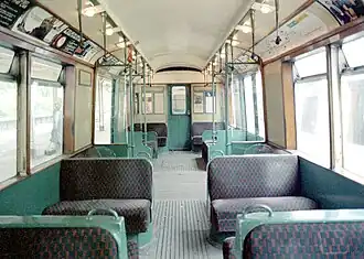 The 51-foot (16 m) long O Stock cars were fitted with air operated doors under the control of the guard. A car had 40 seats and two tip up and access was by two double doors and a single door on each side. Externally, the cars had side panels that flared at the bottom with no running boards to prevent passengers jumping on a moving train and attempting to open a door.[9] The trailers, with four extra seats,[3] had a hinged door at one end, locked closed in normal use, so they could be converted into driving motor cars.[5] Lighting was provided by incandescent bulbs in the ceiling.[3]