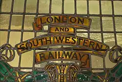 The new station was opened in stages. It was partially ready in 1909, with the main booking hall opening on 11 June 1911.[16] A vehicular roadway to the station opened on 18 December 1911.[26] The connection to Waterloo Junction was removed that March, but a siding remained until 3 May 1925. The bridge remained in place and was used as a walkway between the two stations.[27] Construction of the main station continued sporadically throughout World War I, and the new station finally opened in 1922, with 21 platforms and a 700-foot (210 m) long concourse.[28] The roof and platforms were initially designed by J. W. Jacomb-Hood, who travelled to the US to look at station designs for inspiration.[29] Following Jacomb-Hood's death in 1914, work was taken over by Alfred Weeks Szlumper.[24] It was built in an Imperial Baroque style out of Portland stone.[29] James Robb Scott designed the office range. The new station included a large stained glass window depicting the L&SWR's company crest over the main road entrance, surrounded by a frieze listing the counties served by the railway (the latter still survives today). These features were retained in the design, despite the fact that, by the time the station opened, the Railways Act 1921 had been passed, which spelt the end of the L&SWR as an independent concern.[30]