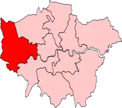 United Kingdom Parliamentary constituencies were redrawn in 1983 and the European constituencies were altered in 1984 to reflect this. The revised seat comprised the following Westminster constituencies: Brentford and Isleworth, Ealing Acton, Ealing North, Ealing Southall, Feltham and Heston, Hammersmith, Richmond and Barnes and Twickenham.[2] The same boundaries were used in 1989 and 1994.[3][4]