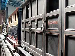 First class coaches had three compartments each; they were very low and narrow, "travellers' knees were pressed uncomfortably hard against those of their opposite neighbour". Second class was equally cramped, and the seat was a bare board; the second class carriages were open to the weather on either side.