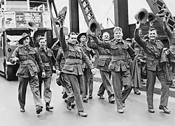 Soldiers from many countries were stationed in London, giving it a more cosmopolitan air than it had previously experienced. Polish, French and Czech soldiers in particular became a more common sight in the city.[123] The Colonial Office financed a mosque in East London to accommodate Muslim soldiers arriving from various parts of the British Empire.[124] Members of the Free French Forces were catered to in Le Petit Club in St. James's Place, run by Olwen Vaughan.[125]