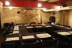 In May 1940, days after Churchill was made Prime Minister, he visited the bunker and said, "This is the room from which I'll direct the war."[88] The complex contained a Cabinet Room where government figures could meet with the armed forces Chiefs of Staff; a Map Room where fronts and ship convoys across the whole war could be mapped out, 24 hours a day; equipment for broadcasting Churchill's speeches on the radio or for contacting American president Franklin D. Roosevelt; bedrooms for Churchill and other high-ranking figures; and offices and sleeping quarters for dozens of typists, stenographers, switchboard operators and secretaries.[89] On 14 August 1945, word reached the complex that Japan had surrendered, and the next day, the officers cleared out their belongings and vacated the premises.[90] The rooms have since been preserved as a museum and opened to the public.[89] The War Cabinet also met at the closed-down Down Street Underground station, which was fitting out with meeting rooms and a bed and bathtub for Churchill's use. After the Cabinet War Rooms were completed, the War Cabinet vacated the station, which became the control centre for the country's rail network and the headquarters of the Railway Executive Committee, with a staff of 75 people.[91]