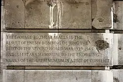Buildings in London still bearing shrapnel marks include the Victoria & Albert Museum, the Tate Britain gallery, St. Clement Danes church, the Ritz Hotel, and Holy Trinity Church in Clapham.[82] The churches of Christchurch Greyfriars and St. Dunstan-in-the-East have been left in ruins and turned into public gardens.[83] The ruins of the church of St. Mary Aldermanbury stood in place for many years after the end of the war, until being dismantled stone-by-stone and shipped to Fulton, Missouri, where the church was rebuilt. Today a garden stands on the spot in London where only the church's foundations remain.[84]