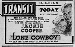 Lone Cowboy is a 1933 American Pre-Code Western film directed by Paul Sloane and written by Paul Sloane, Agnes Brand Leahy, Bobby Vernon, and Will James. The film stars Jackie Cooper, Lila Lee, and Addison Richards. The film was released on December 1, 1933, by Paramount Pictures.[1][2]