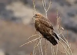 The long-legged buzzard inhabits open, uncultivated areas, with high bushes, trees, cliffs or hillocks are favoured as nesting areas as well as access to freshwater.[3] The species normally lives in steppe, semi-desert and desert edge, barren rocky landscapes, dry shrubland and sometimes sea coasts. More irregularly, the species will adapt to woodland as long as plentiful openings are available.[3][36][48] As a whole slightly hilly plains are ideal nesting areas.[49] In a study in Iran, 41% of long-legged buzzards were on open plains with low vegetation, 29% on plains with somewhat taller vegetation, 12% were in mountain areas and 18% were in cultivated lands.[50] While long-legged buzzards predominantly forage in wildlands, they are also adaptable to cultivations, pastures, village outskirts and sometimes even heavily farmed areas.[3][36][48] Grasslands are often predominantly utilized during winter.[3] Those wintering in the Indian subcontinent largely use similar arid open plains, semi-deserts and cultivated areas but perhaps surprisingly are considered a characteristic wintering raptor of dry mixed forests with open glades and barren hill slopes.[16] In the Indian subcontinent, the species may often be seen using a variety of perches including bushes, hedges, Acacia nilotica, sand dunes, haystacks, mounds and power poles.[16] The North African and Arabian race may reportedly show a strong preference for open wooded and/or rocky areas but has been reported in a similarly broad amount of habitats as the nominate subspecies.[48] The species may occur from sea-level up to about 1,600 m (5,200 ft) in Europe, but in Asia uncommonly lives in mountains at elevations of up to 3,000 m (9,800 ft) or even 3,900 m (12,800 ft) with migrants recorded to 5,000 m (16,000 ft).[3][4] Younger birds disperse north of breeding grounds and there are records from Northern Europe. The breeding population in Greece is around 60 pairs.[51] Reforestation in the Judean Hills in Israel and the West Bank is increasing potential interspecific conflict for other raptors in the vicinity.[52][53]