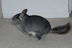 The long-tailed chinchilla (Chinchilla lanigera), also called the Chilean, coastal, common, or lesser chinchilla, is one of two species of rodent from the genus Chinchilla: the other species being C. chinchilla.[4] Both species are endangered in the wild after historically being hunted for their soft hair coats. Domestic breeds of chinchilla are believed to descend from specimens of C. lanigera. Domestic chinchillas come in three types: la plata, costina, and raton.
