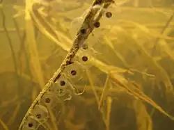 Like all amphibians, the life of a long-toed salamander begins as an egg. In the northern extent of its range, the eggs are laid in lumpy masses along grass, sticks, rocks, or the mucky substrate of a calm pond.[39] The number of eggs in a single mass ranges in size, possibly up to 110 eggs per cluster.[40] Females invest a significant amount of resources into egg production, with the ovaries accounting for over 50% of the body mass in the pre-breeding season. A maximum of 264 eggs have been found in a single female—a large number considering each egg is approximately 0.5 millimeters (0.02 in) in diameter.[41] The egg mass is held together by a gelatinous outer layer protecting the outer capsule of individual eggs.[42] The eggs are sometimes laid singly, especially in warmer climates south of the Canada and US border. The egg jellies contribute a yearly supply of biological material that supports the chemistry and nutrient dynamics of shallow-water aquatic ecosystems and adjacent forest ecosystems.[43] The eggs also provide habitat for water molds, also known as oomycetes.[44]