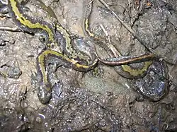 In some lowland areas the adult salamanders will remain active all winter long, excluding cold spells. However, during the cold winter months in the northern parts of its range, the long-toed salamander burrows below the frost-line in a coarse substrate to hibernate in clusters of 8–14 individuals.[40][60] While hibernating, it survives on protein energy reserves that are stored in its skin and along its tail.[61] These proteins serve a secondary function as part of a mixture or concoction of skin secretions that is used for defense.[62] When threatened, the long-toed salamander will wave its tail and secrete an adhesive white milky substance that is noxious and likely poisonous.[55][63] The color of its skin can serve as a warning to predators (aposematism) that it will taste bad.[62] Its skin colors and patterns are diverse, ranging from a dark black to reddish brown background that is spotted or blotched by a pale-reddish-brown, pale-green, to a bright yellow stripe.[37][39] An adult may also drop part of its tail and slink away while the tail bit acts as a squirmy decoy; this is called autotomy.[64] The regeneration and regrowth of the tail is one example of the developmental physiology of amphibians that is of great interest to the medical profession.[65]