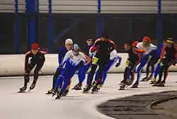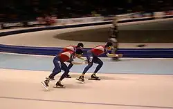 The team pursuit is a team event in speed skating and is skated by teams of three skaters. Races resemble the team pursuit event in track cycling.[17] Two teams race at a time, starting at a line in the middle of the straightaway. One team starts on each side of the track. Only the inner lane is used. The distance is eight laps for men and six for women. The team's time is the third skater to cross the finish line.