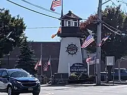 Long Beach Road's southern terminus is at the Long Beach Bridge in the Village of Island Park, at the Island Park–Long Beach border, south of which it becomes Long Beach Boulevard (CR D38).[1][2][3] Continuing north, CR D39 passes through the heart of Island Park, crossing the Long Island Rail Road's Long Beach Branch at grade level, passing the Island Park station and the Island Park Village Hall. The road then continues north for some distance, before turning towards the northeast, soon crossing the Long Beach Branch again at grade level, thence entering Barnum Island and meeting back up with Austin Boulevard (CR C05), turning back towards the north. From there, it continues towards the north, soon passing over a bridge, crossing onto Long Island and entering Oceanside, shortly after which it intersects Daly Boulevard (CR C55). Continuing towards the north, Long Beach Road soon intersects Mott Street (CR D64). It then gently turns towards the north-northwest for a short distance before turning back towards the north, traveling through Oceanside and eventually reaching Atlantic Avenue (CR C04). The road continues towards the north for a short distance, soon intersecting Davison Avenue (CR C56) before reaching a junction one block to the north with Lower Lincoln Avenue (CR D35), at which point Long Beach Road veers towards the northeast.[1][2]
