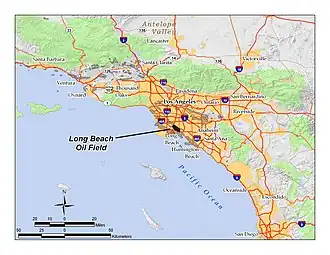 The Long Beach field is one of many in the Los Angeles Basin now largely overbuilt with dense urban development. Even with the dramatic land use changes over the decades since its discovery, it remains moderately productive, with oil wells and oilfield infrastructure intermixed with commercial and residential development. The field underlies the northern portion of the city of Long Beach and most of the city of Signal Hill. In spite of its name, most of the productive area of the field underlies the small city of Signal Hill, which has a population of around 11,000. The main productive area of the field runs from northwest to southeast, about five miles (8 km) long by one across, with the long axis following the Cherry Hill Fault Zone, which is part of the larger Newport–Inglewood Fault Zone, the most significant fault zone traversing the Los Angeles Basin.[8] In the northwest, the oil field begins approximately near the junction of the San Diego Freeway (I-405) and the 710 (the Long Beach Freeway), and proceeds roughly paralleling the 405 freeway to near the intersection of Lakewood Boulevard and California State Route 1 (the Pacific Coast Highway) at their traffic circle in Long Beach. A small portion of the field, no longer productive, is in the city of Lakewood, and another small isolated part of the field, the "Recreation Park Area", lies to the southeast of the main field. The total productive area of the entire field is 1,725 acres (6.98 km2).[9]