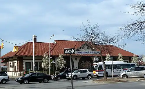 Due to repeated storm damage to rails and other equipment, the LIRR petitioned the New York State Public Service Commission to move the station 1000 feet north in January 1909, which was fully endorsed by the Estates of Long Beach who even offered to exchange land with the railroad.[9] That permission was granted in February of the same year. The present depot at Park Avenue was built in June 1909, and is larger than the previous station off the Atlantic Coast. It was designed by Kenneth M. Murchison, who also designed the 1913-built Jamaica station[10] and Hoboken Terminal. Over a year later, the station and the line were electrified. The station also included a baggage house and express freight office along track number 10.[11][12] Beginning in the early 1960s, store fronts began operating in front of the station along the street and continued to do so until the station was renovated in 1988. Another renovation in the early 2000s added a parking garage, bus depot, and platform bridge. The bus depot is on Centre Street adjacent to the station building, and the parking garage contains a section for bicycles.