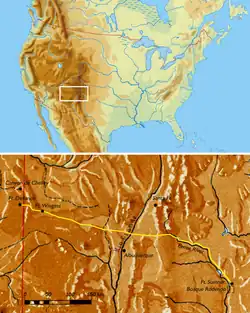 The "Long Walk" started at the beginning of spring 1864. Bands of Navajo led by the Army were relocated from their traditional lands in eastern Arizona Territory and western New Mexico Territory to Fort Sumner (in an area called the Bosque Redondo or Hwéeldi by the Navajo) in the Pecos River valley (Bosque Redondo is Spanish for "round forest"—in New Mexican Spanish a bosque means a river-bottom forest usually containing cottonwood trees). The march was very difficult and pushed many Navajos to their breaking point. Many began the walk exhausted and malnourished, others were not properly clothed and were not in the least prepared for such a long journey. They were also treated cruelly by the soldiers leading the march. They were never informed as to where they were going, why they were being relocated, or how long it would take to get there.[15] One account passed through generations within the Navajos shows the attitude of the U.S. Army: