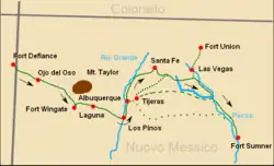 The campaign to subdue the Navajo by the Army was supplemented by raids by New Mexican and Ute slavers who fell on isolated bands of Navajo, killing the men, taking the women and children captive, and capturing horses and livestock. During the army campaign the Ute scouts attached to the army unit engaged in this activity and left destruction of Navajo infrastructure to the main army unit.[18] Following the surrender of the Navajo, the Utes continued to raid the Navajo as did New Mexican slavers.[19] A large number of slaves were taken and sold throughout the region.[20]