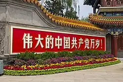 "Long live the Chinese Communist Party" (Chinese: 中国共产党万岁; pinyin: Zhōngguó Gòngchǎndǎng Wànsuì) is a political slogan in China. It originated from a manifesto issued during the 2nd National Congress of the Chinese Communist Party in July 1922. The slogan and its variations gradually began to be used in various fields as political propaganda slogans.