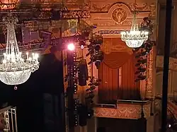 Next to the boxes is a flat proscenium arch.[25] The inner edge of the archway contains a molded band of shells. A wider band with foliate and latticework motifs also surrounds the archway.[24] News sources from 1913 describe the band being made of gold and "breccia violet marble".[10][12] Above the center of the arch is a cartouche, which is decorated with foliate motifs; the cartouche overlaps both the wide band and the entablature above it. The entablature is decorated with helmets and symbols of laurel bands, spears, and shields.[24] The proscenium measures 34 feet 10 inches (10.62 m) high and 35 feet 0 inches (10.67 m) wide. The depth of the auditorium to the proscenium is 29 feet 7 inches (9.02 m), while the depth to the front of the stage is 32 feet 3 inches (9.83 m).[20] The stage measures 70 feet (21 m) wide and either 36 feet (11 m)[11][12] or 46 feet (14 m) deep.[10]