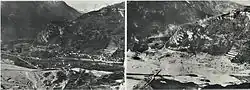 The village was destroyed in the Vajont Dam disaster on October 9, 1963, when a landslide from Monte Toc forced 270 million cubic metres (350×106 cu yd; 9,500×106 cu ft) of water over the top of the Vajont Dam. Longarone lay in the immediate path of the wave of mud and water which swept into the valley below.[2] 1,917 villagers were killed.