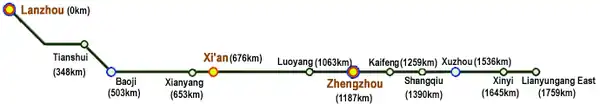 The Longhai railway (Chinese: 陇海铁路; pinyin: Lǒnghǎi Tiělù), formerly romanized as the Lunghai railway, is a major arterial east–west railway in China. It runs from Lianyungang, Jiangsu, on the Yellow Sea to Lanzhou, Gansu, through the provinces of Jiangsu, Anhui, Henan, Shaanxi, and Gansu, covering a total length of 1,759 kilometres (1,093 mi). The line is named after Gansu, also known as Long (陇) in Chinese and Lianyungang's previous name, Haizhou.[1] The Longhai Line is one of the busiest Chinese railways. It has dual tracks throughout and electrification was completed in 2009.