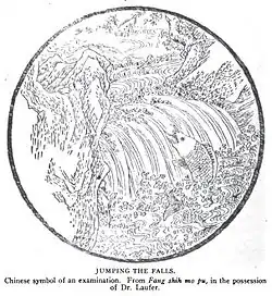 In Chinese mythology, Longmen (lit. 登龍門 "Dragon Gate") is located at the top of a waterfall cascading from a legendary mountain. The legend states that while many carp swim upstream against the river's strong current, few are capable or brave enough for the final leap over the waterfall. If a carp successfully makes the jump, it is transformed into a powerful dragon.[1] The legend is so famous that throughout China, a common saying is that "a student facing his examinations is like a carp attempting to leap the Dragon Gate."