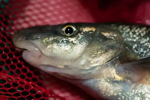 The longnose dace (Rhinichthys cataractae) is a freshwater minnow native to North America. Rhinicthys means snout fish (reference to the long snout) and cataractae means of the cataract (first taken from Niagara Falls). Longnose dace are small, typically less than 100 mm and characterized by their fleshy snout that protrudes past the mouth. They are well adapted for living on the bottom of fast-flowing streams among stones. Longnose dace eat algae and aquatic insects and are important forage minnows for larger predatory fish.