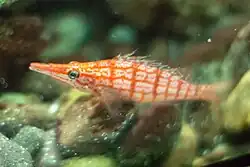The longnose hawkfish (Oxycirrhites typus) is a species of marine ray-finned fish, a hawkfish belonging to the family Cirrhitidae. It is found on tropical reefs of the Indian Ocean and the Pacific Ocean, where it can be found at depths around 10 to 100 m (33 to 328 ft). It prefers the steep outer slopes of the reefs amongst gorgonians and black corals. This species can reach 13 cm (5.1 in) in total length. It can also be found in the aquarium trade. It is currently the only known member in its genus.[2]