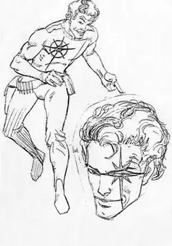 A design for the character of Longshot was put forward by Carl Potts, who outfitted the character in a jumpsuit that Adams thought to be reminiscent of the Starfleet uniforms from Star Trek: The Motion Picture.[2] Nocenti suggested that Longshot look distinct from other superheroes. She prescribed that he be an alien, have only four fingers on each hand, and has an unusual spine, though this last trait was not mentioned in the comics.[4] Adams created his own design, and wanting to distinguish the character visually, based his mullet haircut on that of musician Limahl, as no other major Marvel character had such a haircut.[2] Adams, who disliked the practice of having characters produce weapons and other devices from their boots or secret pockets that had never before been established, decided to include some pouches on the character's belt, a practice that influenced the artwork of the founders of Image Comics.[5] Nocenti came up with the idea of having Longshot's left eye glow when he uses his power for noble causes: "I was living in a loft on 26th and Sixth and we had a one-eyed cat. I'd go out at night and I'd see this one eye [glowing in the dark]."[6]