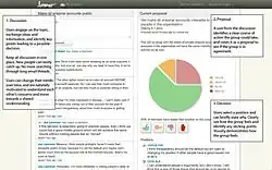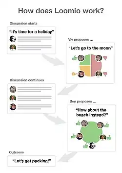 Loomio is decision-making software and web service designed to assist groups with collaborative, consensus-focused decision-making processes. It is a free software[3] web application, where users can initiate discussions and put up proposals.[4][5][6][7] As the discussions progress to initiating a proposal, the group receives feedback through an updatable pie chart[5] or other data visualizations. Loomio is basically a web based forum (has optional email delivery interface) with tools to facilitate conversations and decision making processes from starting and holding conversations to reaching outcome.[8]