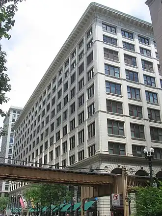 The district's period of historic significance was 1872–1949.[2] In the late 1860s, Potter Palmer improved State Street by building his own Palmer House hotel on State Street in 1870.[4] He had also convinced Marshall Field and Levi Leiter to move the Field, Leiter & Co. store to State Street in 1868.[5] Chicago's retailing center was State Street (anchored by Marshall Field's) in the downtown Loop after the Great Chicago Fire of 1871.[6] Convenient mass transit such as streetcars and elevated trains, supported a retail corridor along State Street from Lake Street to Van Buren Street.[6] State Street became a shopping destination during the 1900s, and is referred to in Frank Sinatra's song Chicago (That Toddlin' Town), where Frank refers it to "State Street, that Great Street." At one time seven major department stores were situated on State Street: Benson & Rixon, Karolls, Charles A. Stevens and Mandel Brothers (in addition to Marshall Field's and Carson, Pirie Scott).[7]