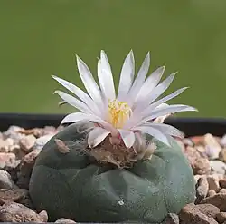 Lophophora diffusa, commonly known as false peyote, is a species of plant in the family Cactaceae and one of the species in the Lophophora genus. It is endemic to Mexico in the outskirts of Querétaro.[3] This species contains zero to trace amounts of mescaline. Instead, pellotine is the principal alkaloid - the psychoactive effects of which are comparatively minimal. The species name diffusa refers to the flat tubercles that are outspread without the plant having prominent ribs.[4]