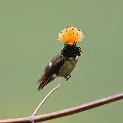 Lophornis is a genus of hummingbird in the family Trochilidae. These are all tiny birds, ranking among the smallest hummingbirds. No species exceeds 9 cm (3.5 in) and most are under 7.5 cm (3.0 in) in total length, weighing 3 grams or less. The male coquettes are noted from their outlandish, colorful crests and markings, the females being more subdued.