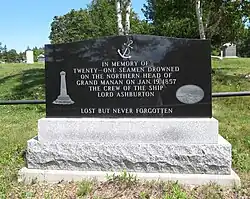 The victims' bodies were recovered and buried in the cemetery at North Head, near the scene of the shipwreck. The grave site was marked by a wooden plaque until a stone monument was erected in 1910, bearing the inscription "In memory of 21 seamen drowned on the northern head of Grand Manan Jan. 19th 1857 belonging to the ship Lord Ashburton."[8] In 2011 a new monument replaced the 1910 stone.