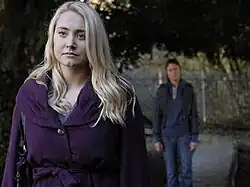 When episodes that were intended to feature the storyline transmitted, they instead featured a selection of then "last minute" scenes. In these scenes Hodgkiss portrays a new character, Caroline, who holds Loretta and Jake hostage.[27]