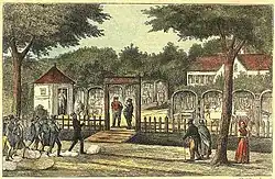 The property Haabet (The Hope, now No. 7) was on 31 March 1804 purchased by Lars Mathiesen from steward at Frederiksberg Palace Marcus Friederich Voigt. On 27 February that same year he had been granted a royal license to open a guesthouse and beer garden at the site. Mathiesen ran the establishment for 50 years. It attracted a wide range of common and more cultivated guests and was a particularly popular venue for both large and small student gatherings. Mathiesen was a jovial and popular character who as he grew old was almost seen as the uncrowned king of Frederiksberg. His literary acquaintances comprised Knud Lyhne Rahbek and Adam Oehlenschläger. In 1829, Oehlenschläger even rented a summer residence in Haabet's backyard.[1]