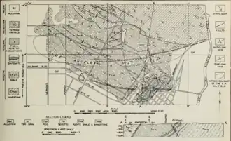 Structurally the field is a faulted anticline which trends generally east to west, with oil accumulations trapped in sand units dipping south, ending to the north either at a fault – in the eastern part of the field – or at the surface as tar seeps, in the western area.[2] Mechanisms of entrapment include pinchouts and local changes of permeability – forms of stratigraphic traps – and structural traps such as oil-bearing units blockaded by unrelated, impermeable units put there by motion along faults. Three separate producing horizons, or vertical zones, are present in the Puente Formation, and are given ordinal numbers: First, Second, and Third zones. In addition to these zones, small pockets of oil have been found throughout the upper part of the Puente.[5] The average depth of the three zones from top to bottom is 900, 1,100, and 1,500 feet.[6] Although wells have been drilled to much greater depths – for example, Seaboard Oil Company of Delaware drilled over 7,500 feet (2,300 m) into the Topanga Formation, of Miocene age – no commercial quantities of oil have been found at these great depths.[6]
