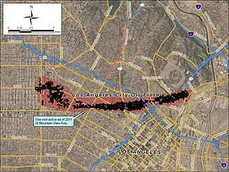 ![]() The Los Angeles City Oil Field in the Los Angeles Basin of southern California. Other oil fields are shown in light gray. | |