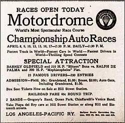 - ^ "COMPLETE PROGRAM OF MOTORDROME RACES". The Daily Outlook (Santa Monica, California). March 15, 1910. p. 6. Retrieved August 11, 2012.