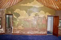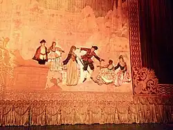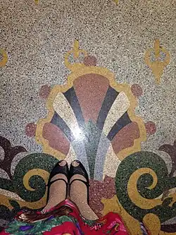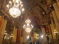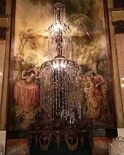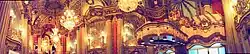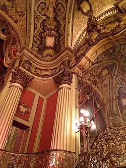 This Los Angeles Theatre was constructed in late 1930 and early 1931. It was commissioned by H.L. Gumbiner, an independent film exhibitor from Chicago,[3] who also built the nearby Tower Theatre.[4] Designed by S. Charles Lee,[5] and Samuel Tilden Norton, the theater features a French Baroque interior. With its grand central staircase and gold brocade drapes, it has for many years been considered to be among the city's most lavish landmarks.[6] The opulent interior is said to have been modeled after the Hall of Mirrors in Versailles.[7] A crystal fountain stands at the top of the grand staircase, a restaurant and a ballroom were on the lower level.[7]