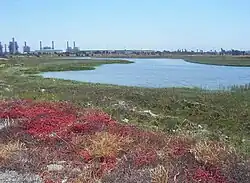 Most of the remaining open space, once a thriving wetlands consisting of tidal salt marshes, lagoons, bays and alkali meadows where the San Gabriel River flows into the Pacific Ocean,[8] is currently privately owned and used for oil operations. With climate change and its impacts becoming more prevalent, the phenology at Los Cerritos Wetlands has started to become disrupted. Rising sea levels related to climate change threatens to drown the marsh and wetland forever. This will be exacerbated if levees are removed to allow additional seawater to enter this ecosystem. Increased salt water can change the dynamic of the wetlands. Overall, every aspect of the marsh can reflect the effects of climate change.[9] More than 90% of California wetlands have been destroyed due to urbanization, agriculture, and manipulation of local watersheds. Any remaining wetland is considered to be threatened because of all these factors.[10] There is a lack of viable wetlands that can support native and migrating fauna. This is why a coalition of public and private entities are working together to protect, purchase, and restore the remaining roughly 500 acres.[9]