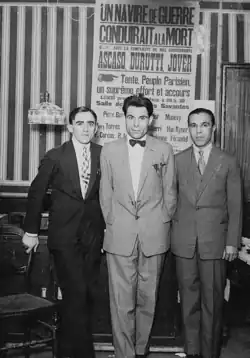 On 7 October 1926, the trial of Ascaso, Durruti and Jover began at the Palais de Justice; they were all charged with the use of false passports, while Ascaso and Durruti faced charges for possession of prohibited weapons. The courtroom audience was packed with police informants, to prevent sympathisers from observing the trial.[80] Due to his knowledge of the French language, Durruti spoke for the group: he stated that they planned to abduct the king and hold him until a revolution broke out in Spain; he also confessed to their possession of weapons and false passports. He justified their actions due to the political repression by the Primo de Rivera dictatorship, stating that the Spanish people wanted an end to the dictatorship and that they could not have avoided the dictatorship's spy networks without using false passports.[81] The group was defended by the French lawyers Henri Torrès and Henri Berthon, who pressed the French police into admitting that they had been given all their information on the defendants by the Spanish embassy. Berthon himself praised the defendants and said he was honoured to be defending "the most advanced sector of the Spanish opposition".[82]